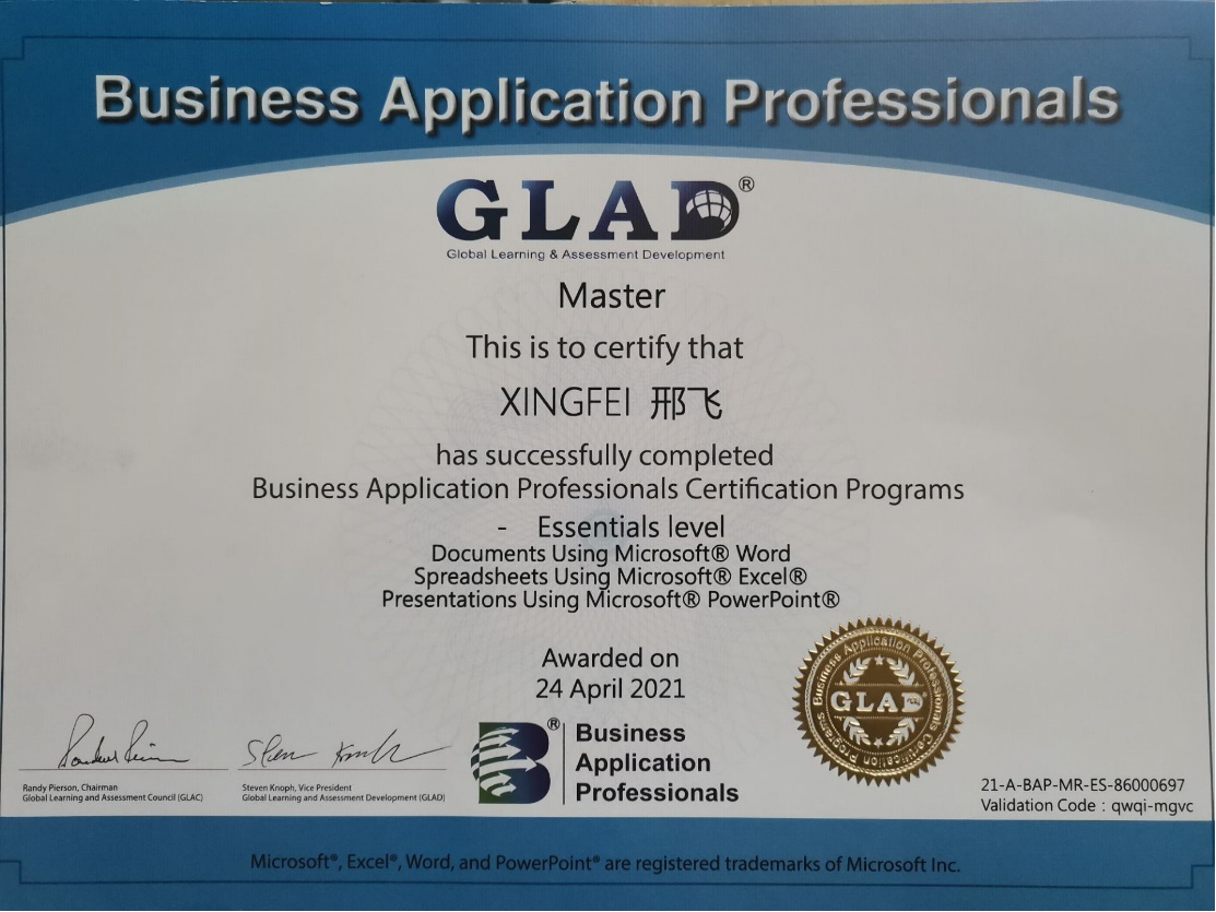 邢飞获得GLAD大师级证书。GLAD大师级证书的获得需要连续三年分别报考文字处理赛项、电子表格赛项、简报设计赛项,并在三个赛项满分1000分的情况下,均获得700分以上的分数才能获得。邢飞同学为此也付出了大量的时间和坚持不懈的努力。