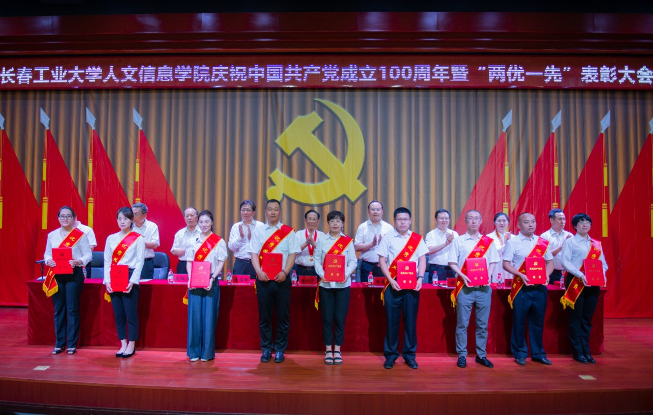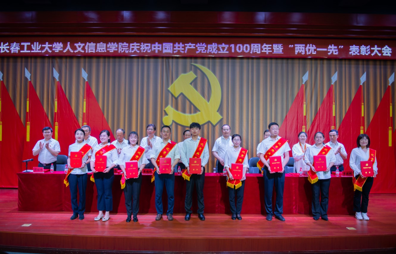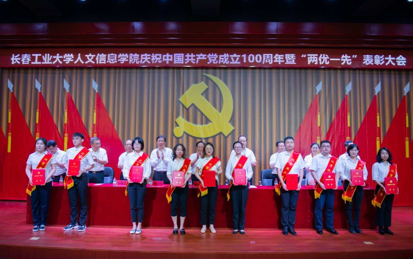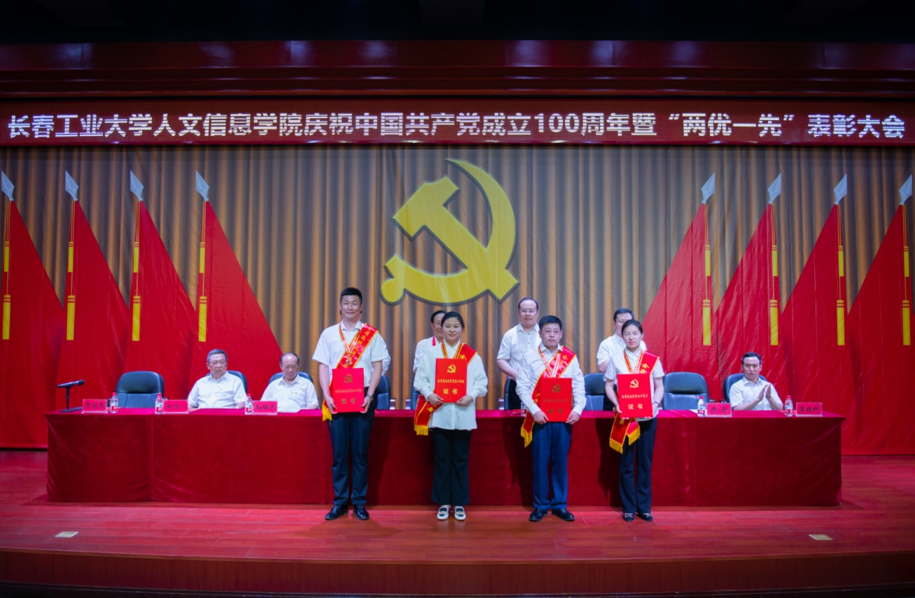 党委副书记周丹宣读我校受到省委和省委教育工委表彰的“两优一先”名单及《中共长春工业大学人文信息学院委员会关于表彰优秀共产党员、优秀党务工作者和先进基层党组织的决定》。
