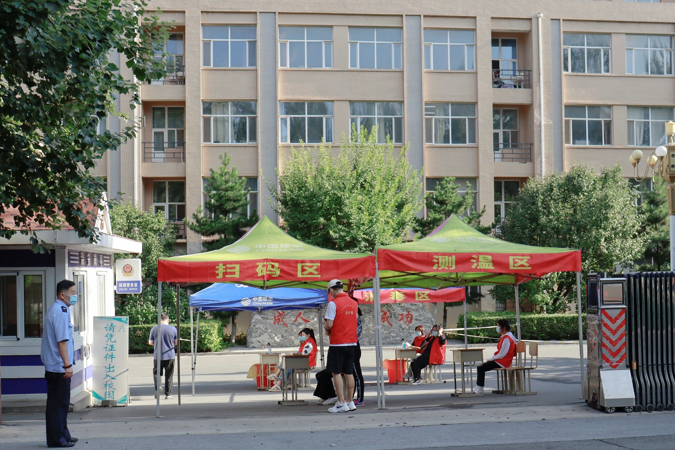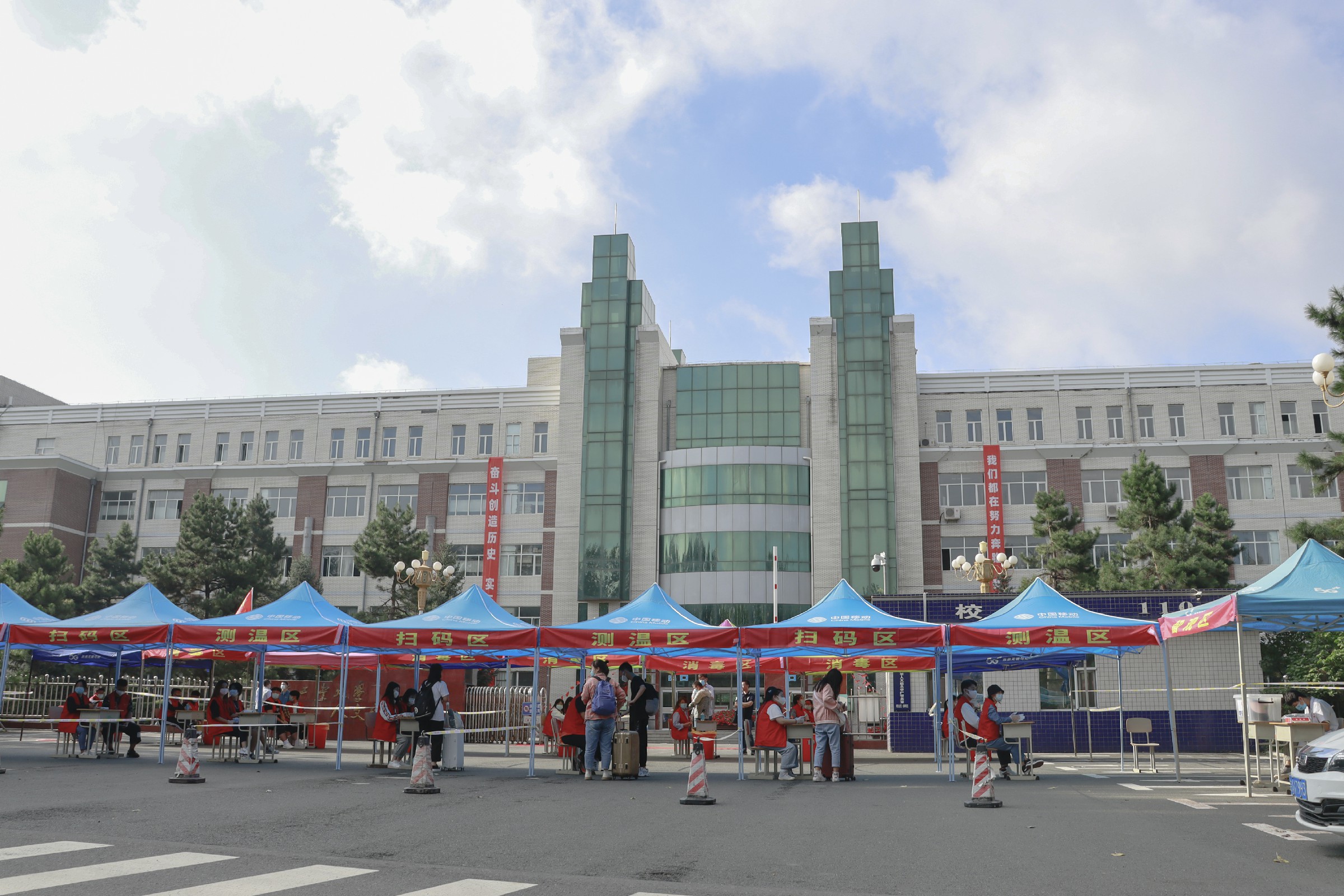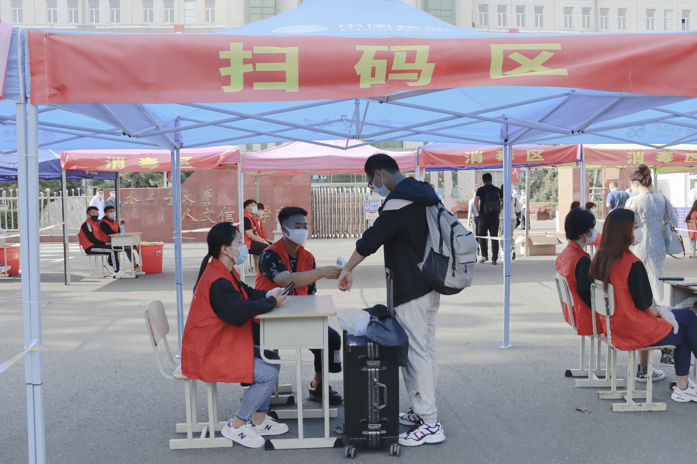 8月27日早7点,长春工业大学人文信息学院迎来了首批秋季开学返校学生。他们在现场工作人员和志愿者的引导下,有序扫描“吉祥码”、体温检测、身份核对、更换口罩,并对携带物品进行消毒。