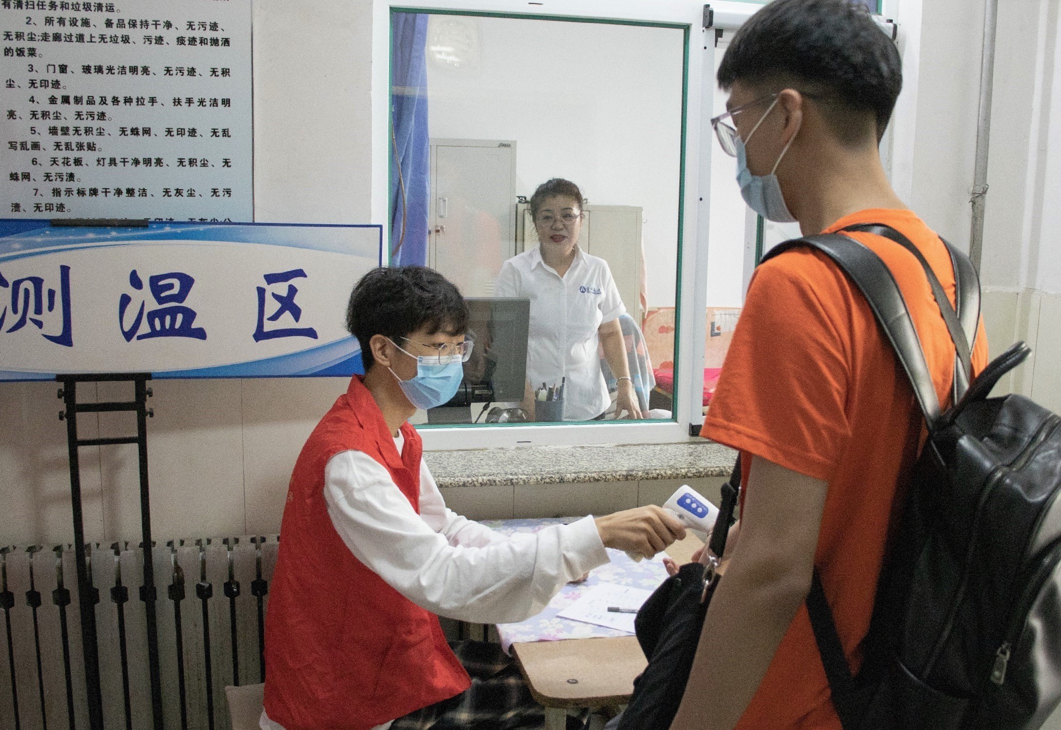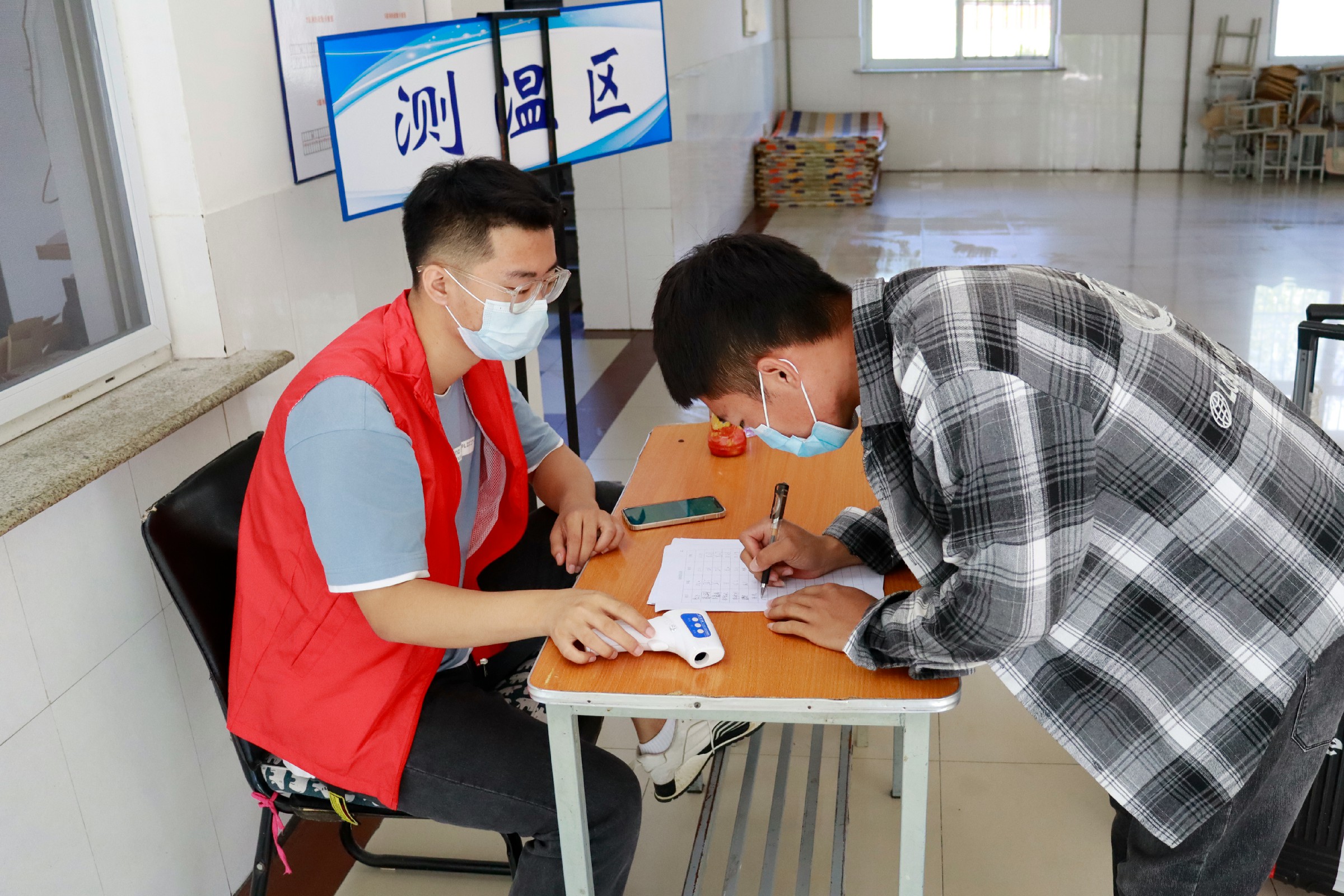 进入宿舍前,同学们再次进行体温检测和信息登记,确保全覆盖的健康监测和健康保护。
