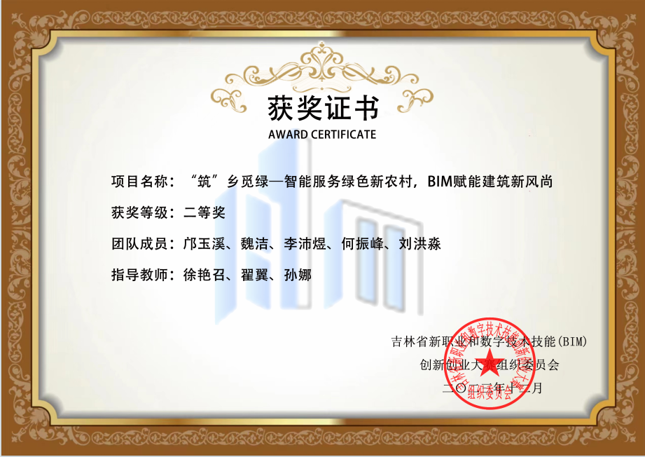 BIM已成为助力建筑全生命周期信息化、数字化、智能化的前沿技术和发展趋势。本次成绩的取得,是我校BIM人才培养与职业应用深度融合的结果,更是新职业新技术与创新创业深度融合的结果。以本次大赛为契机,我们将秉承“强技能、育人才、就新职、创新业、兴吉林、赢未来”的理念,为吉林省振兴发展培养优秀专业人才。