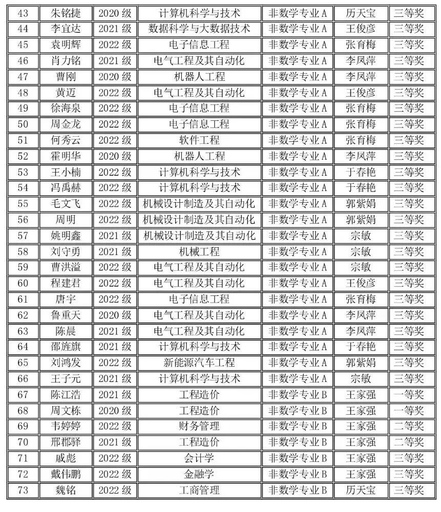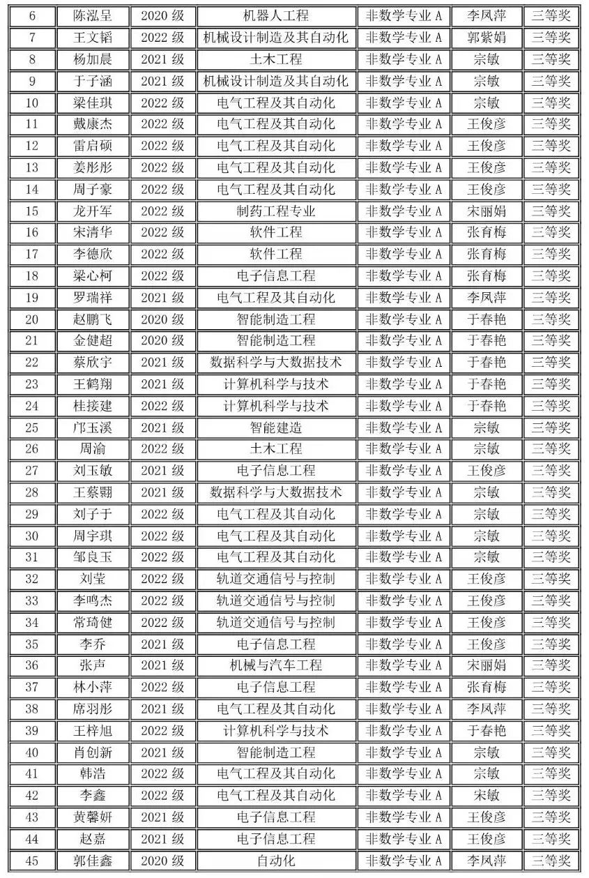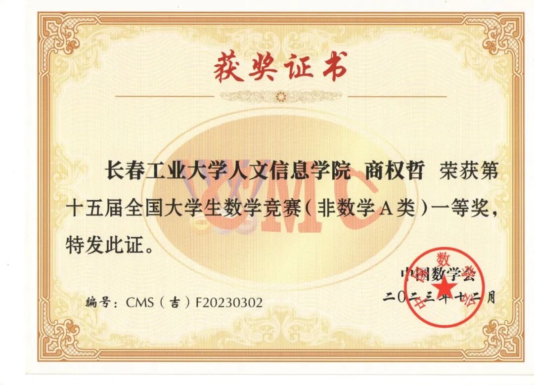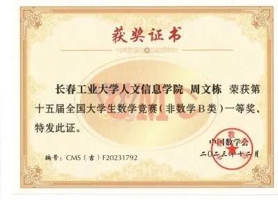 2023年11月11日上午,竞赛在全国各高校同时举行,全国共有1100多所高校28万大学生参赛,我校有210名同学报名参赛,同吉林省20多所高校7500余名学子共同竞技。我校学生在竞赛中取得好成绩,73位同学分别获得全国大学生数学竞赛非数学专业组(A,B类)一等奖17人、二等奖25人、三等奖31人;62名同学获得2023年吉林省大学生数学竞赛三等奖;并且张育梅老师指导的赵宇辉同学最终入选全国总决赛(吉林省30名),取得了历史性的突破。指导教师张育梅、王家强、历天宝获得优秀指导教师奖。学校向获奖的学生和指导教师表示祝贺!