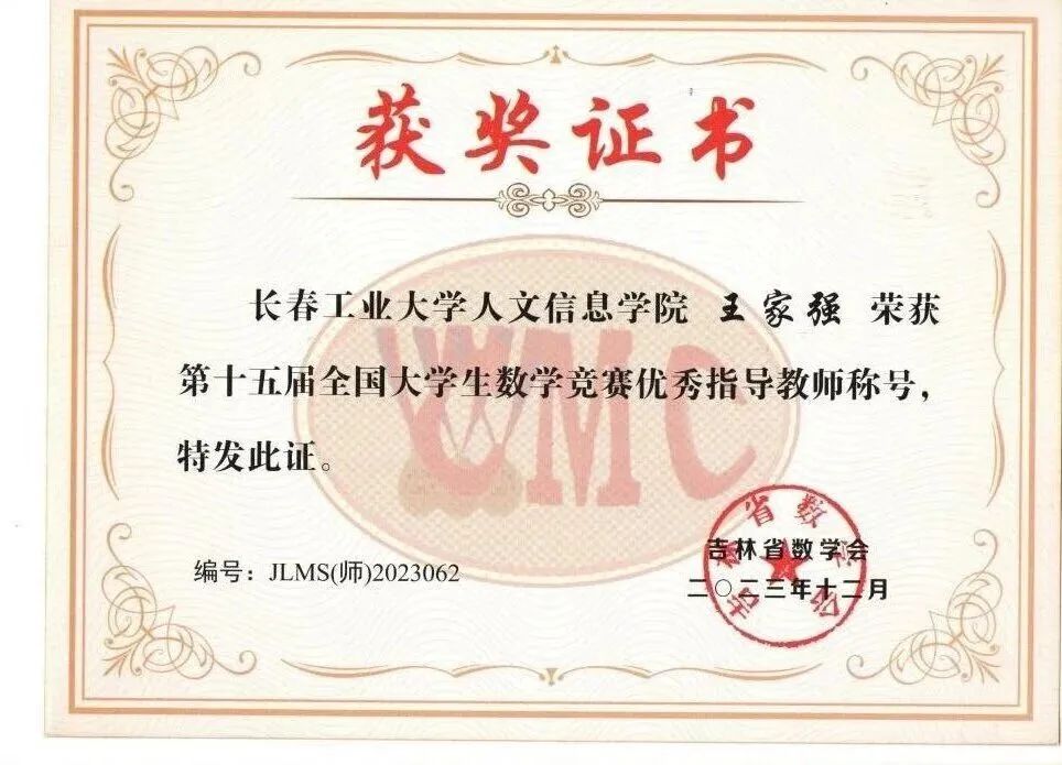 2023第十五届全国大学生数学竞赛优秀指导教师证书