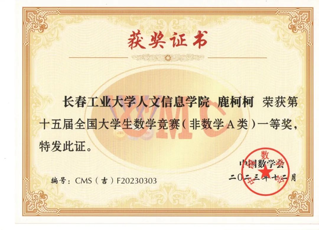 2023年第十五届全国大学生数学竞赛学生一等奖证书