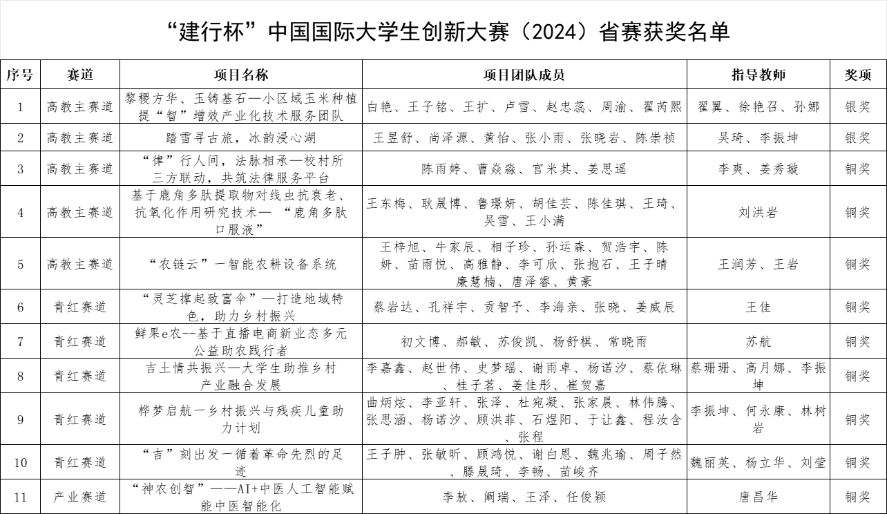 近日,由吉林省教育厅、四平市人民政府等10个部门联合主办,吉林师范大学、吉林工程职业学院共同承办、中国建设银行吉林省分行协办的“建行杯”中国国际大学生创新大赛(2024)吉林省总决赛落下帷幕并公布了成绩,我校共斩获11个奖项。其中,银奖2项,铜奖9项,创造了我校在该项赛事中历史最好成绩。