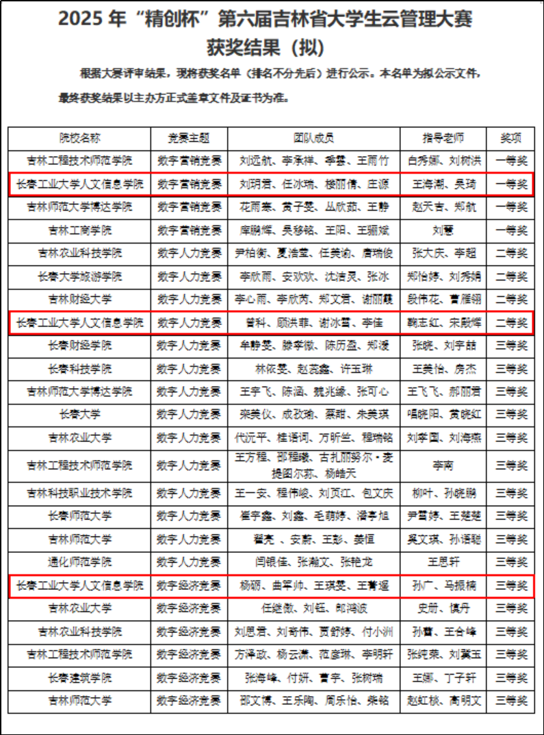 近日,由吉林省教育厅指导的“精创杯”第六届吉林省大学生云管理大赛结果揭晓。本次大赛全省高等院校共有100余支队伍参赛,我校管理学院16名参赛学子组成的四支代表队经过激烈角逐,共获一等奖1项、二等奖1项、三等奖1项,展现出扎实的专业素养和良好的团队协作能力。