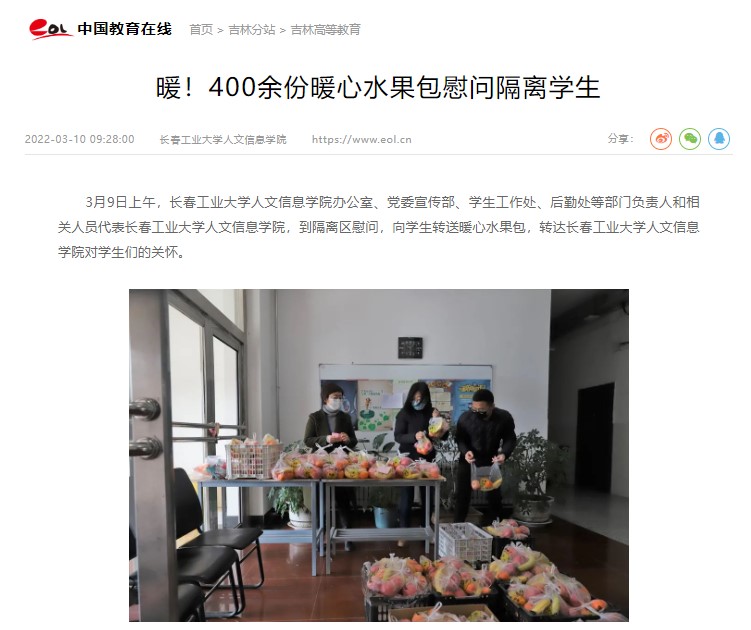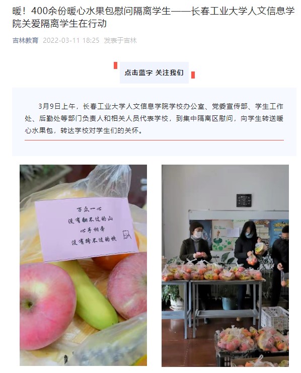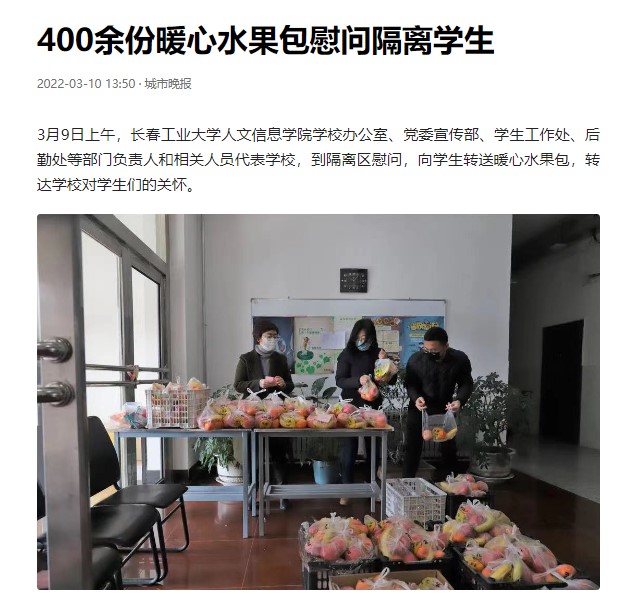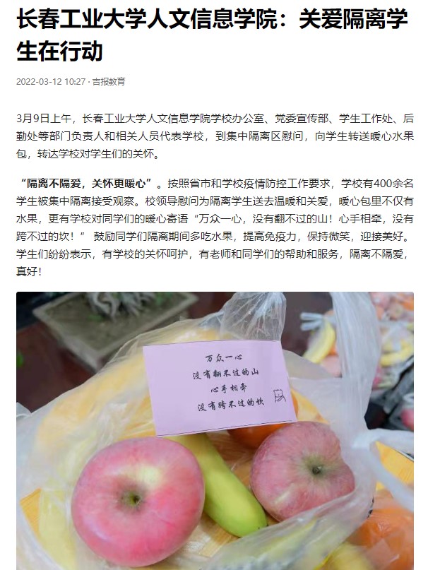 3月9日上午,学校办公室、党委宣传部、学生工作处、后勤处等部门负责人和相关人员,到隔离区慰问,向学生转送暖心水果包,转达学校对学生们的关怀。被“中国教育在线”“吉林教育”“吉报教育”“城市晚报”等媒体报道。