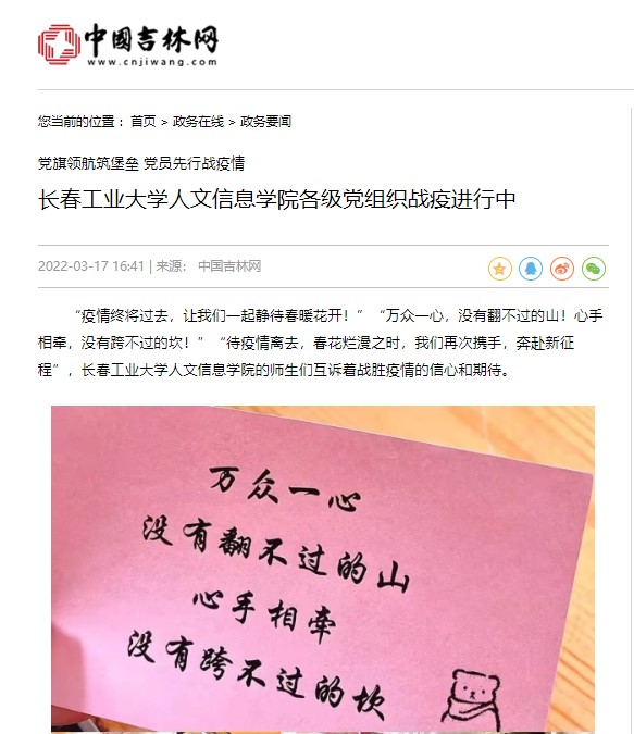 党旗领航筑堡垒,党员先行战疫情,奋战在抗疫一线的学校各级党组织和广大共产党员用责任和担当,与全体在校学生一同坚守、风雨同舟、共克时艰,用实际行动生动诠释了“我是党员我先上”的使命担当,为彻底打赢疫情防控阻击战贡献力量!“中国教育在线”“中国吉林网”等媒体对我校党组织战疫工作进行了专题报道。