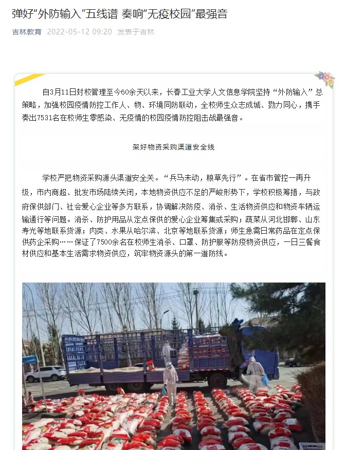 自3月11日封校管理至今60余天以来,学校坚持“外防输入”总策略,加强校园疫情防控工作人、物、环境同防联动,全校师生众志成城、勠力同心,携手奏出7531名在校师生零感染、无疫情的校园疫情防控阻击战最强音。我校疫情防控工作被“中国教育在线”“网易新闻”“新浪吉林”“吉林教育”“吉报教育今日头条”等媒体报道。