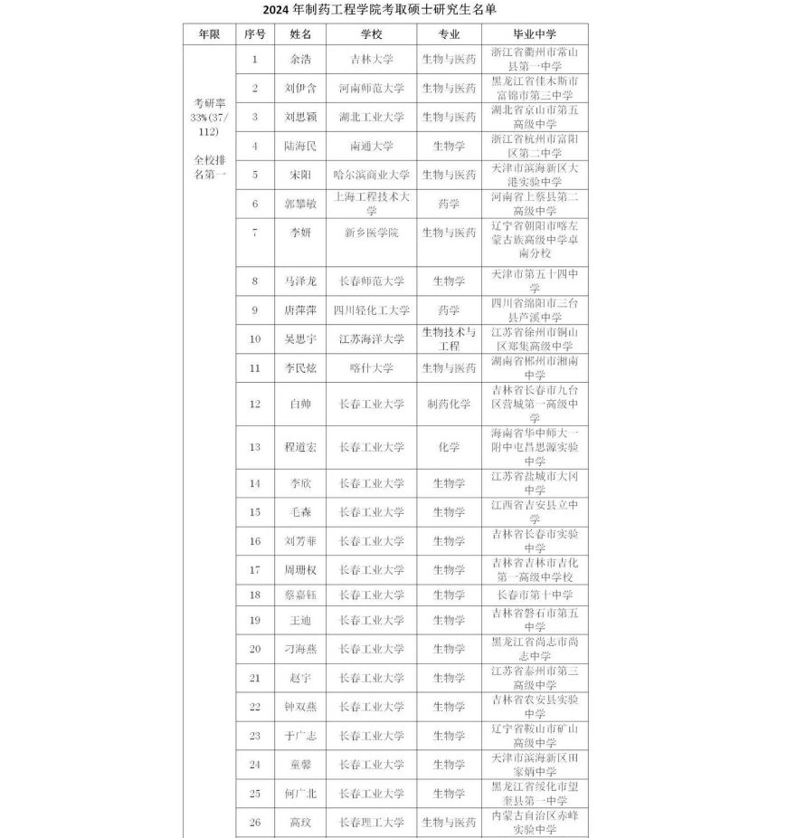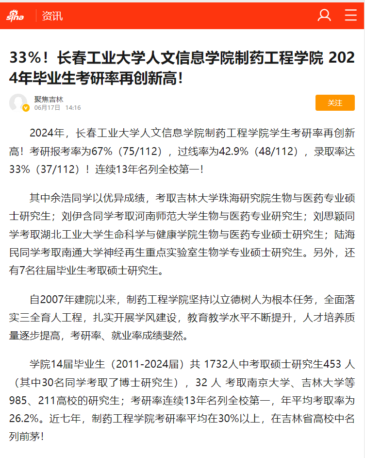 2024年,长春工业大学人文信息学院制药工程学院毕业生考研成功率高达33%,连续13年领跑全校。