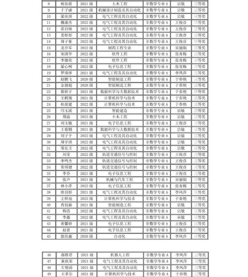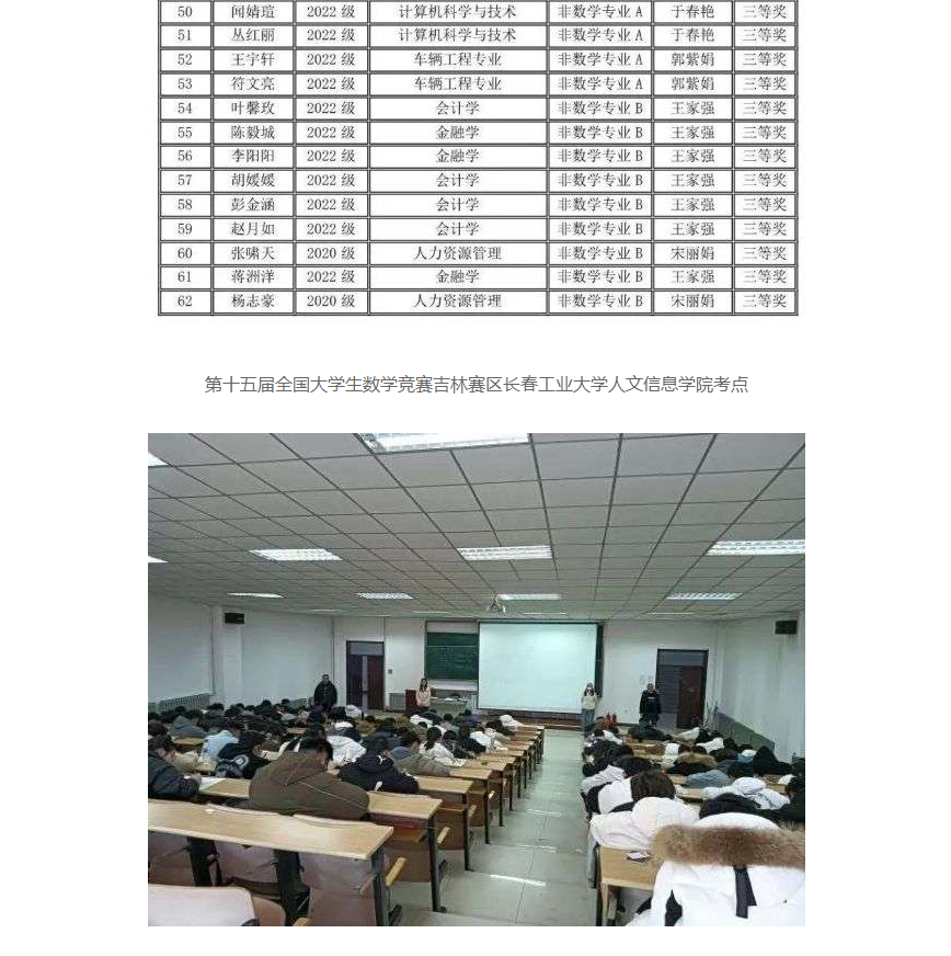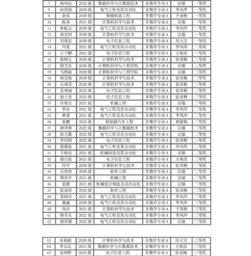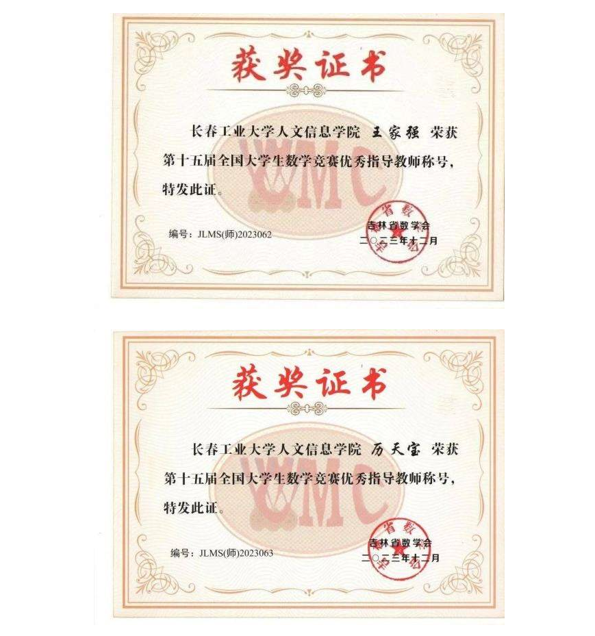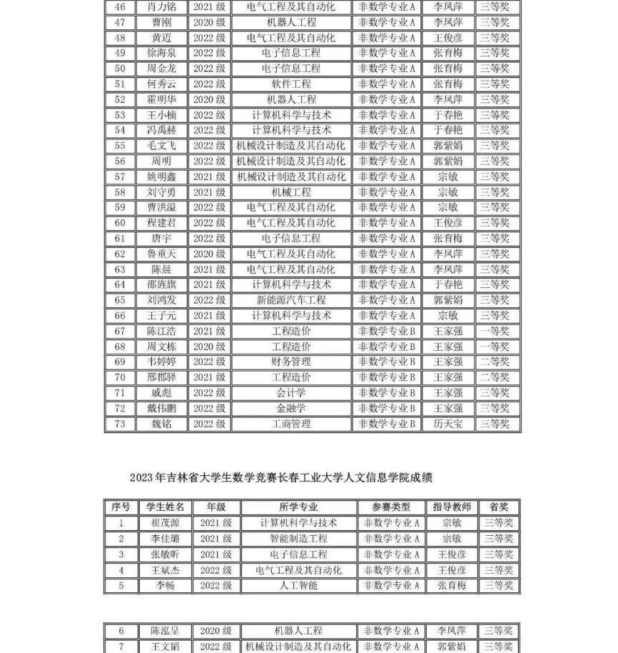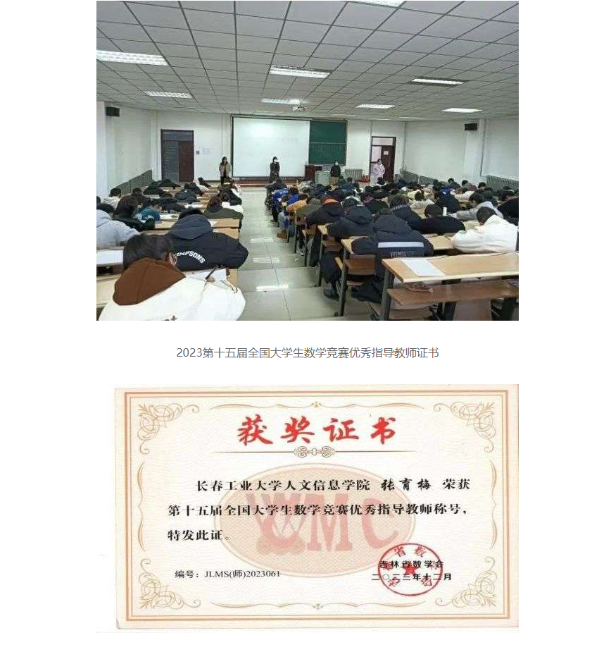 在全国第十五届大学生数学竞赛中我校有210名同学报名参赛,其中73位同学分别获得全国大学生数学竞赛非数学专业组(A,B类)一等奖17人、二等奖25人、三等奖31人;62名同学获得2023年吉林省大学生数学竞赛三等奖;并且张育梅老师指导的赵宇辉同学最终入选全国总决赛(吉林省30名),取得了历史性的突破。指导教师张育梅、王家强、历天宝获得优秀指导教师奖。
