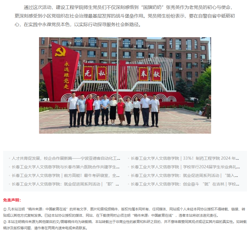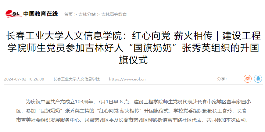为庆祝中国共产党成立103周年,7月1日早 8 点,建设工程学院师生党员代表赴长春市宽城区富丰家园小区,参加“国旗奶奶”张秀英主持的“红心向党·薪火相传”升国旗仪式。学校党委组织部部长王春玲,长春市吉美社会组织发展服务中心、民盟宽城区委及长春市宽城区柳影街道富丰路社区代表,共同参加本次活动。 中国教育在线对我校党员参加吉林好人“国旗奶奶”张秀英组织的升国旗仪式进行媒体报道