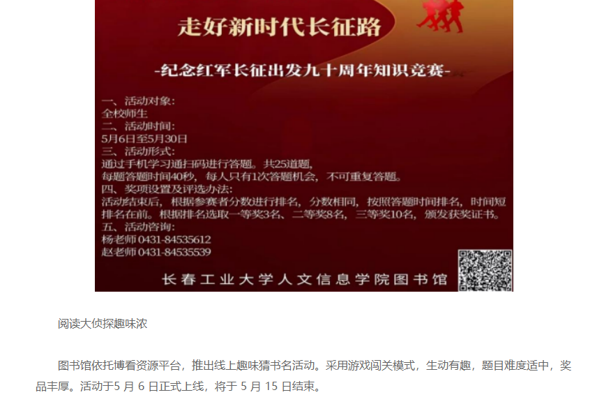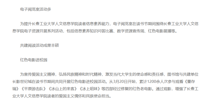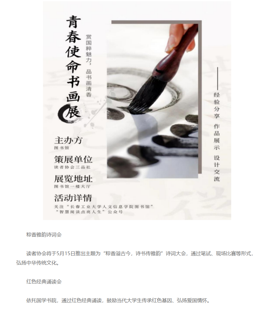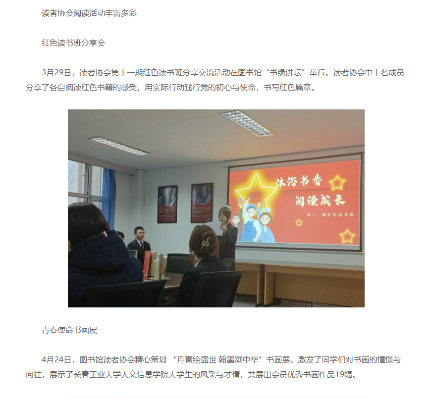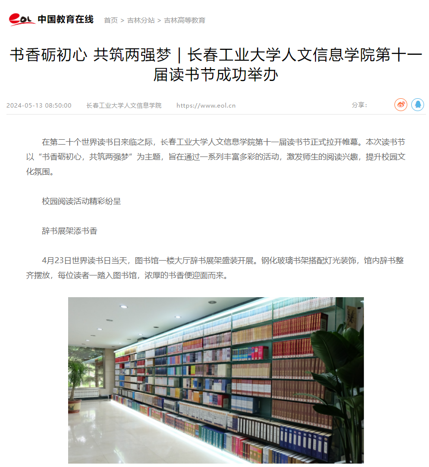 在第二十个世界读书日来临之际,长春工业大学人文信息学院第十一届读书节正式拉开帷幕。本次读书节以“书香砺初心,共筑两强梦”为主题,旨在通过一系列丰富多彩的活动,激发师生的阅读兴趣,提升校园文化氛围。