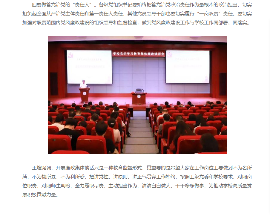 7月3日下午,学校在学术报告厅召开党纪学习教育集体廉政谈话会。学校创建人、董事长张兆华,校长潘福林,党委书记王煊等领导班子成员,党委委员,各部门负责人以及全校党员教职工共同参会。王煊在会上作集体廉政谈话。