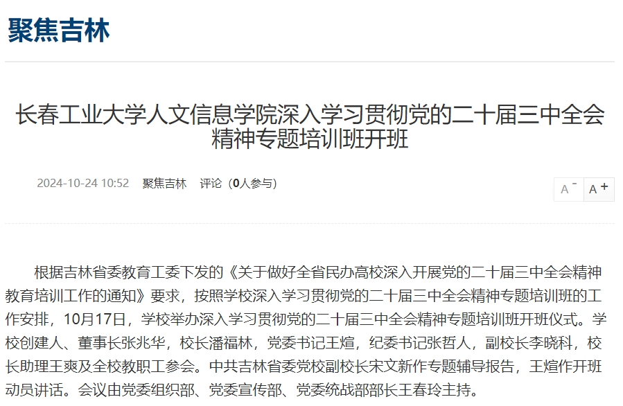 新浪吉林对我校深入学习贯彻党的二十届三中全会精神专题培训班开班进行报道。