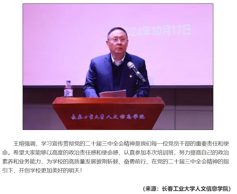 根据吉林省委教育工委下发的《关于做好全省民办高校深入开展党的二十届三中全会精神教育培训工作的通知》要求,按照学校深入学习贯彻党的二十届三中全会精神专题培训班的工作安排,10月17日,学校举办深入学习贯彻党的二十届三中全会精神专题培训班开班仪式。学校创建人、董事长张兆华,校长潘福林,党委书记王煊,纪委书记张哲人,副校长李晓科,校长助理王爽及全校教职工参会。中共吉林省委党校副校长宋文新作专题辅导报告,王煊作开班动员讲话。会议由党委组织部、党委宣传部、党委统战部部长王春玲主持。