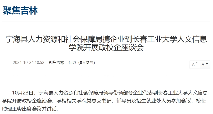 新浪吉林对宁海县人力资源和社会保障局携企业到我校开展政校企座谈会进行报道。