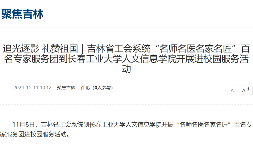 新浪吉林对吉林省工会系统“名师名医名家名匠”百名专家服务团到我校开展进校园服务活动进行媒体报道。