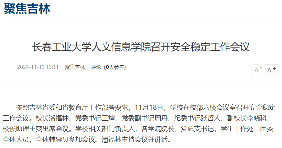 按照吉林省委和省教育厅工作部署要求,11月18日,学校在校部六楼会议室召开安全稳定工作会议。校长潘福林、党委书记王煊、党委副书记周丹、纪委书记张哲人、副校长李晓科、校长助理王爽出席会议。学校相关部门负责人,各学院院长、党总支书记,学生工作处、团委全体人员,全体辅导员参加会议。潘福林主持会议并讲话。