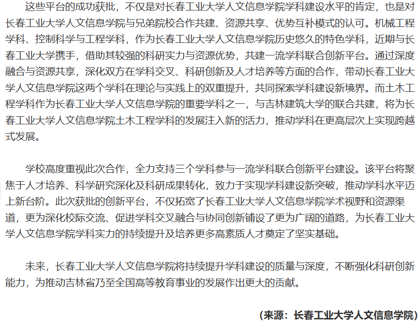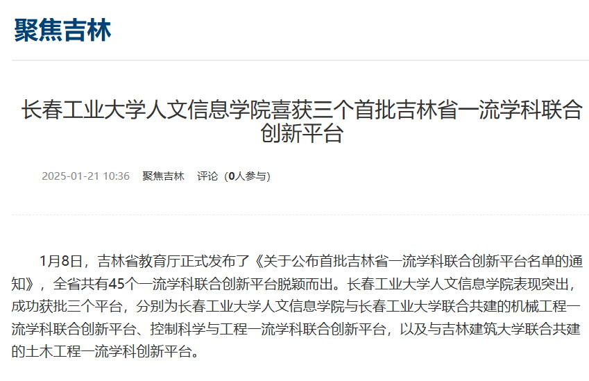 1月8日,吉林省教育厅正式发布了《关于公布首批吉林省一流学科联合创新平台名单的通知》,全省共有45个一流学科联合创新平台脱颖而出。长春工业大学人文信息学院表现突出,成功获批三个平台,分别为长春工业大学人文信息学院与长春工业大学联合共建的机械工程一流学科联合创新平台、控制科学与工程一流学科联合创新平台,以及与吉林建筑大学联合共建的土木工程一流学科创新平台。