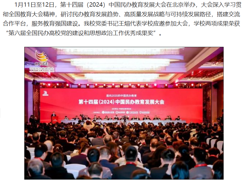 1月11日至12日,第十四届(2024)中国民办教育发展大会在北京举办,大会深入学习贯彻全国教育大会精神,研讨民办教育发展趋势、高质量发展战略与可持续发展路径,搭建交流合作平台,服务教育强国建设。我校党委书记王煊代表学校应邀参加大会,学校两项成果荣获“第六届全国民办高校党的建设和思想政治工作优秀成果奖”。