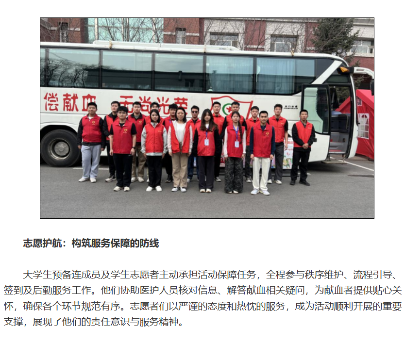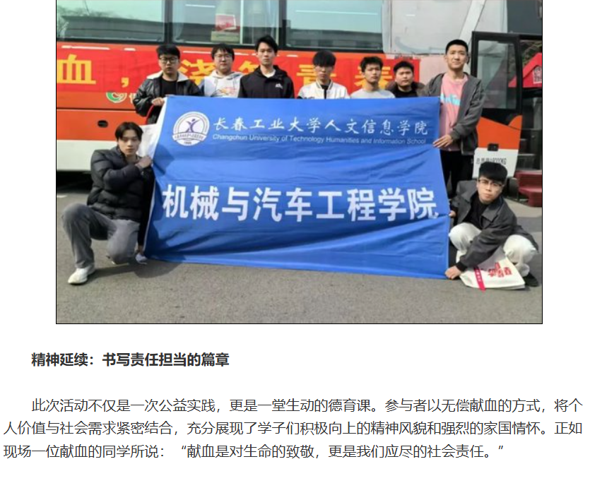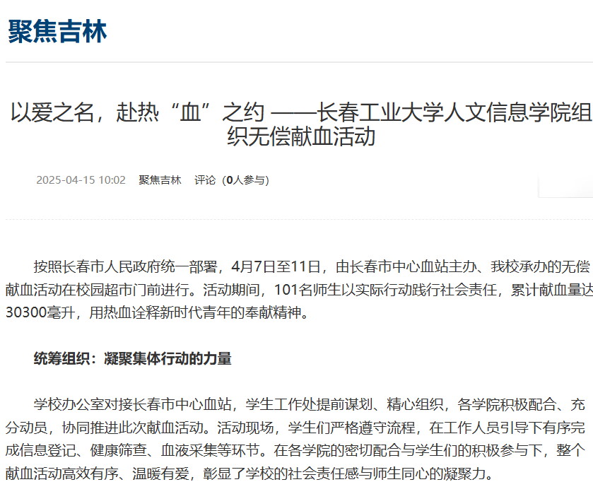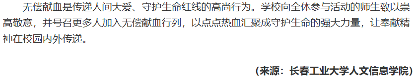 按照长春市人民政府统一部署,4月7日至11日,由长春市中心血站主办、我校承办的无偿献血活动在校园超市门前进行。活动期间,101名师生以实际行动践行社会责任,累计献血量达30300毫升,用热血诠释新时代青年的奉献精神。