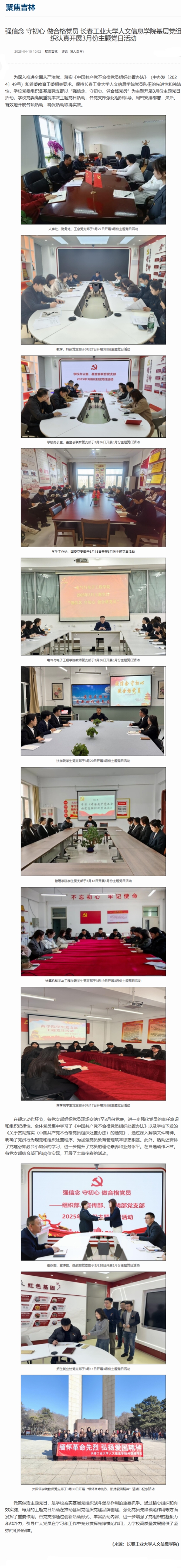 新浪吉林对我校强信念 守初心 做合格党员 长春工业大学人文信息学院基层党组织认真开展3月份主题党日活动进行报道。