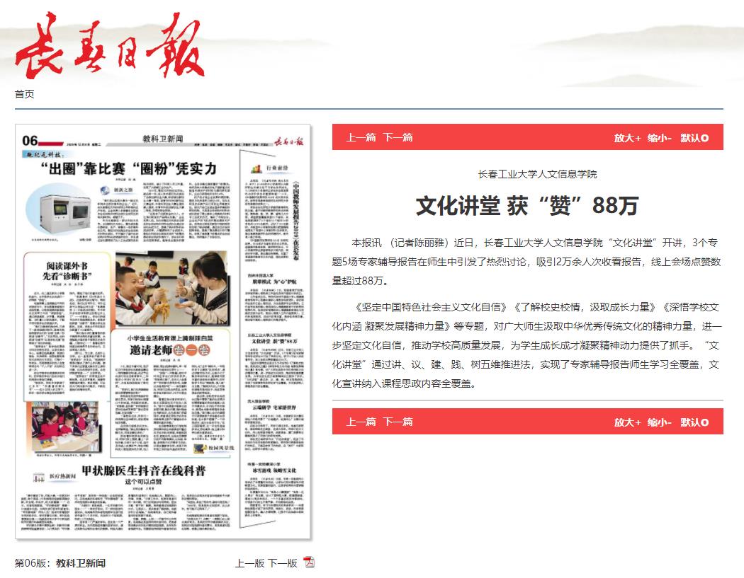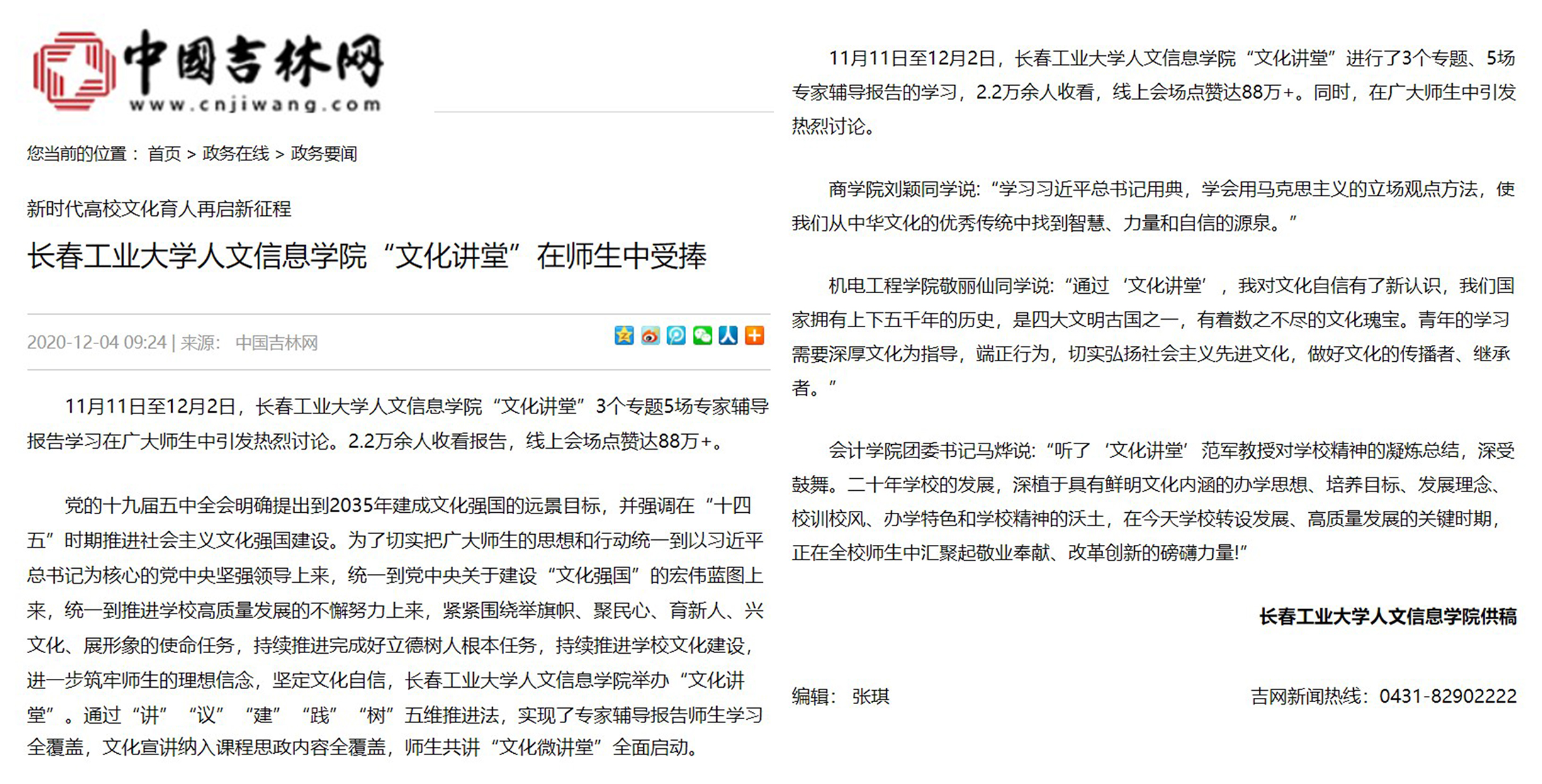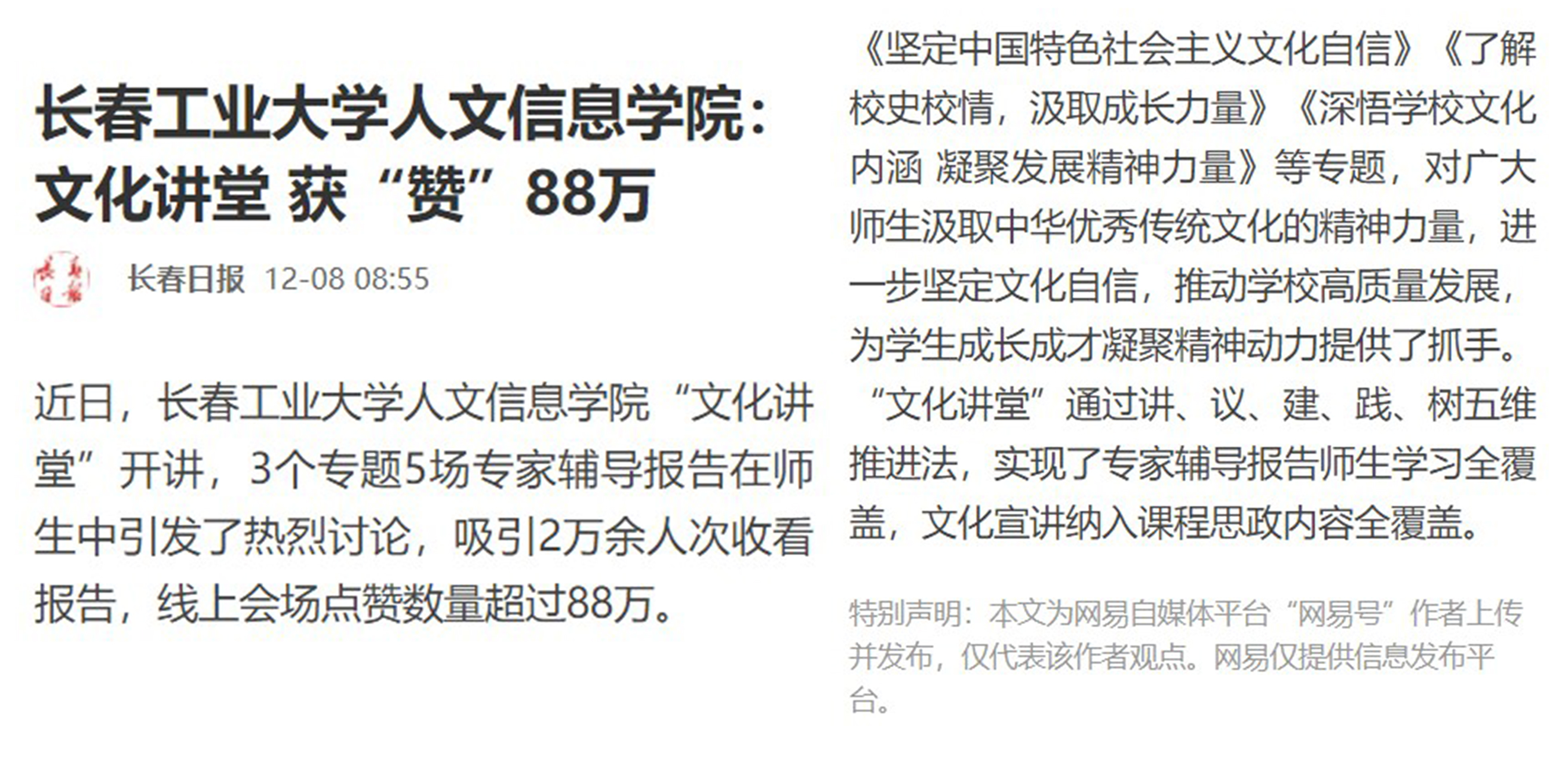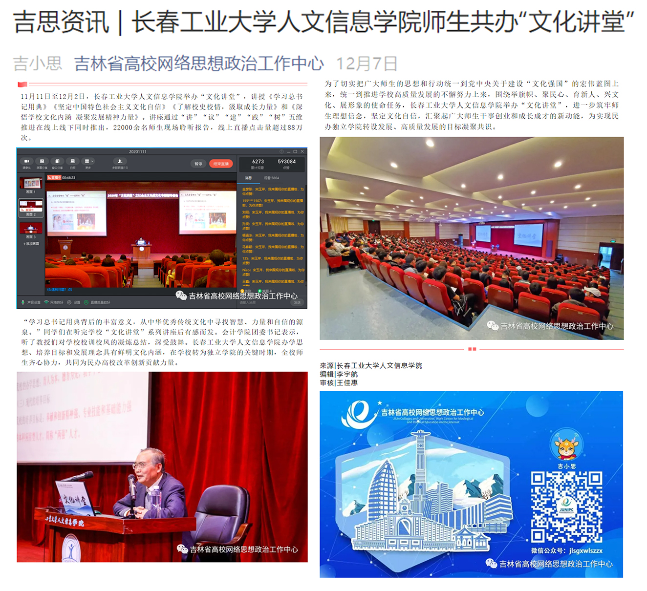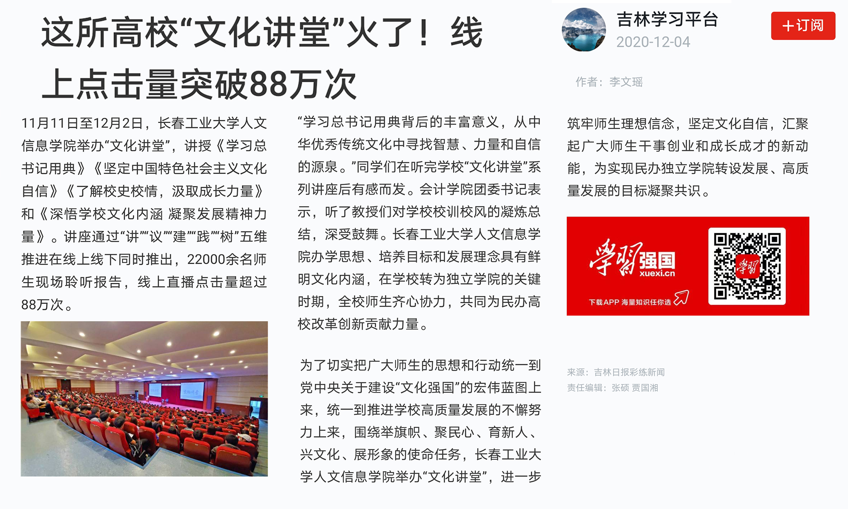 11月11日至12月2日,长春工业大学人文信息学院举办“文化讲堂”,讲授“学习习近平总书记用典”、“坚定中国特色社会主义文化自信”、“了解校史校情,汲取成长力量”和“深悟学校文化内涵 凝聚发展精神力量”。讲座通过“讲”“议”“建”“践”“树”五维推进在线上线下同时推出,22000余名师生现场聆听报告,线上直播点赞量超过88万次。
